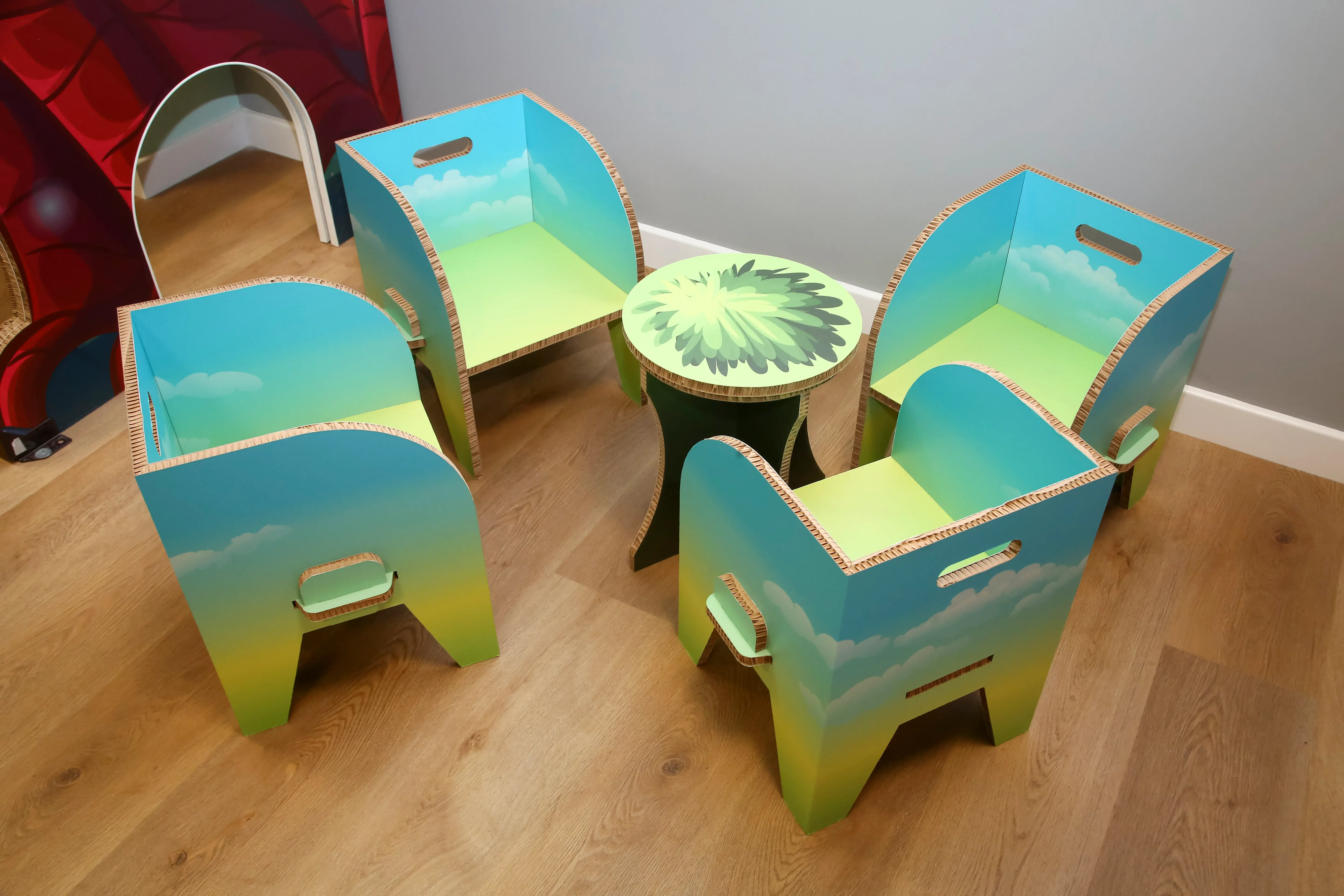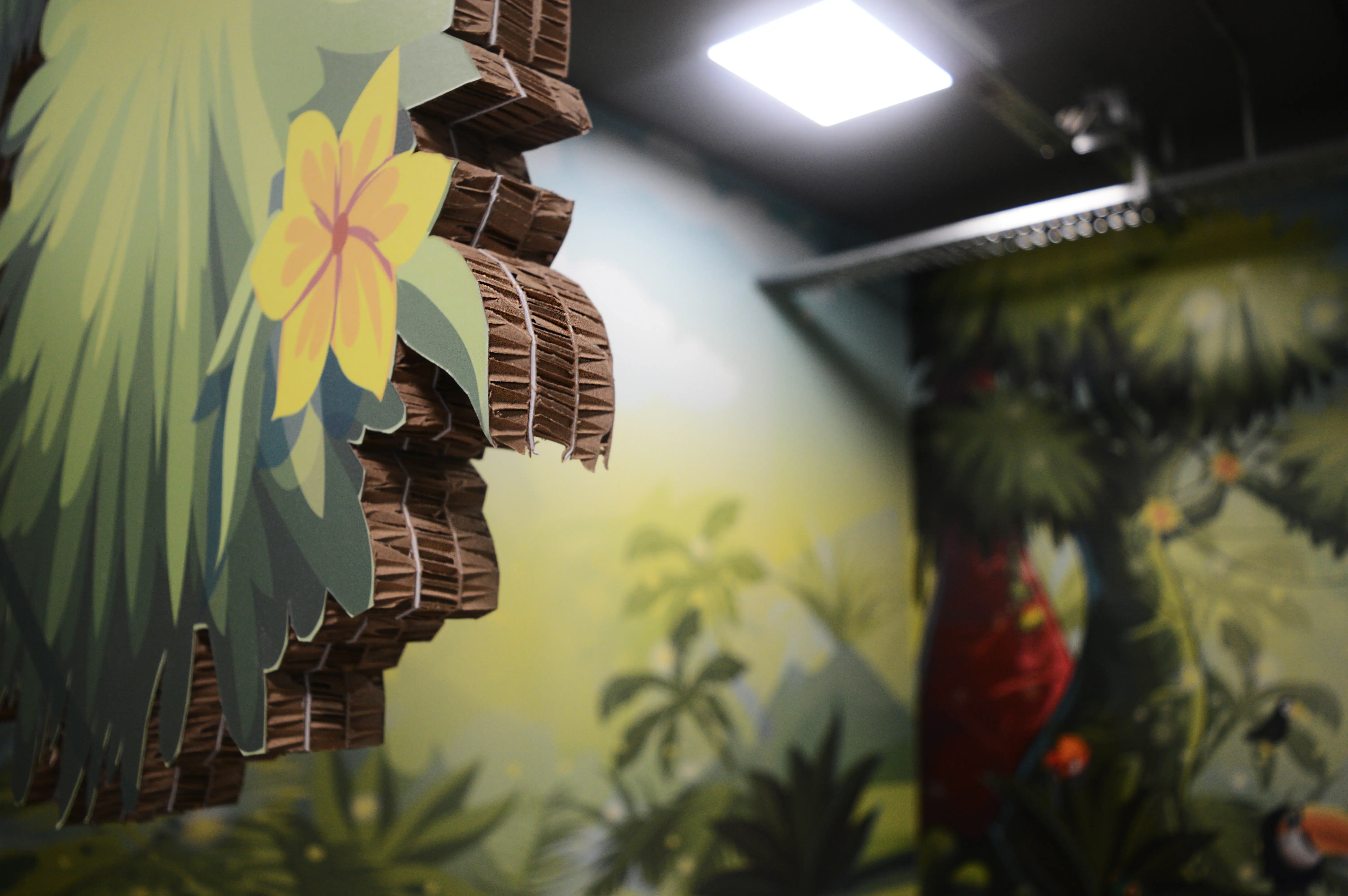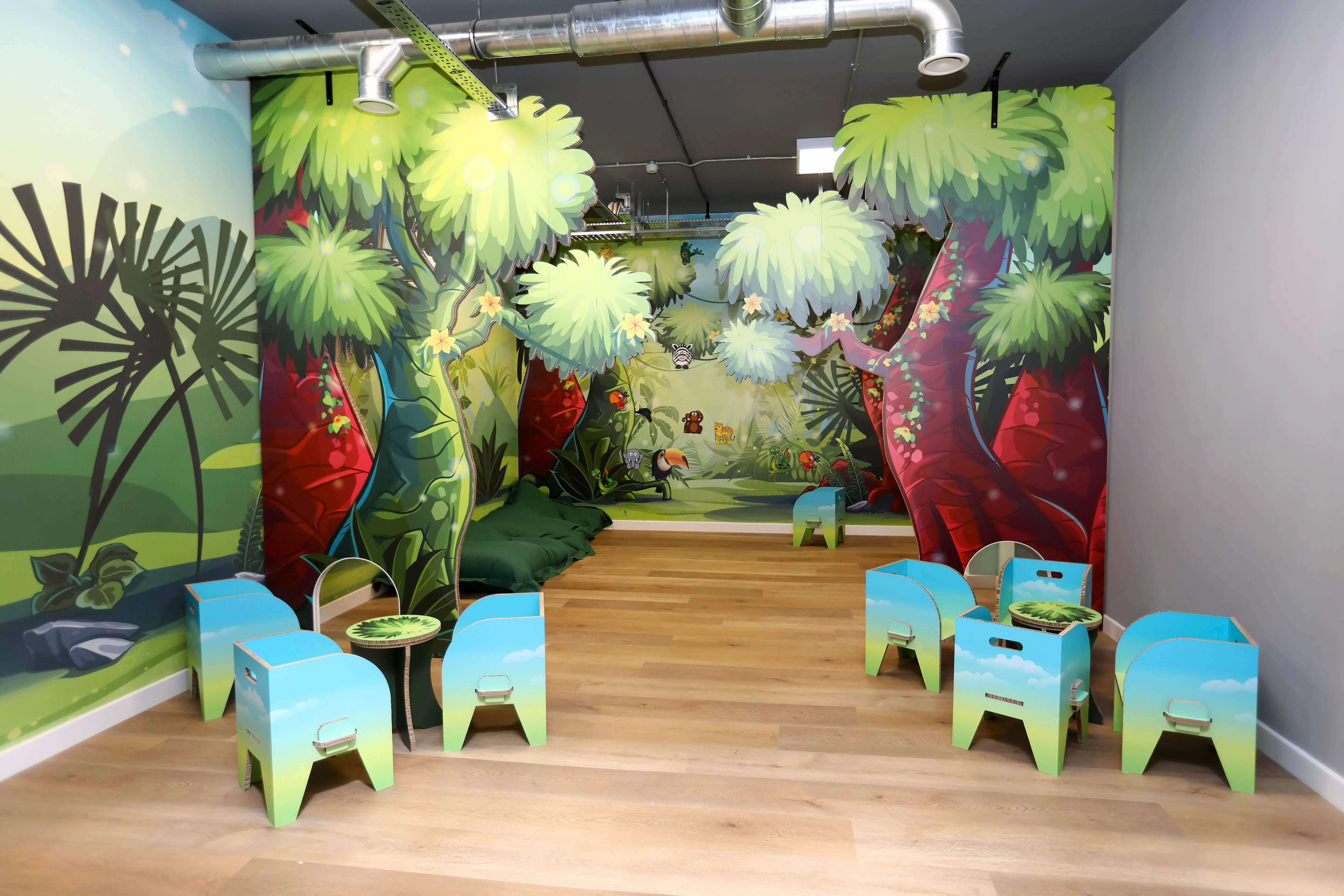 One of the sustainable materials that we used was a robust and durable substrate in the children’s play area. As a result, we produced vertical partitions to create trees. These had small arches for the children to crawl through to enter a magical forest land. Which was something entirely unique that I haven’t seen done before in a children’s play area. Impressive, impactful and innovatively green. All of which delivered a 3D effect coupled with jungle printed wallpaper and a magnetic wall in the play area.