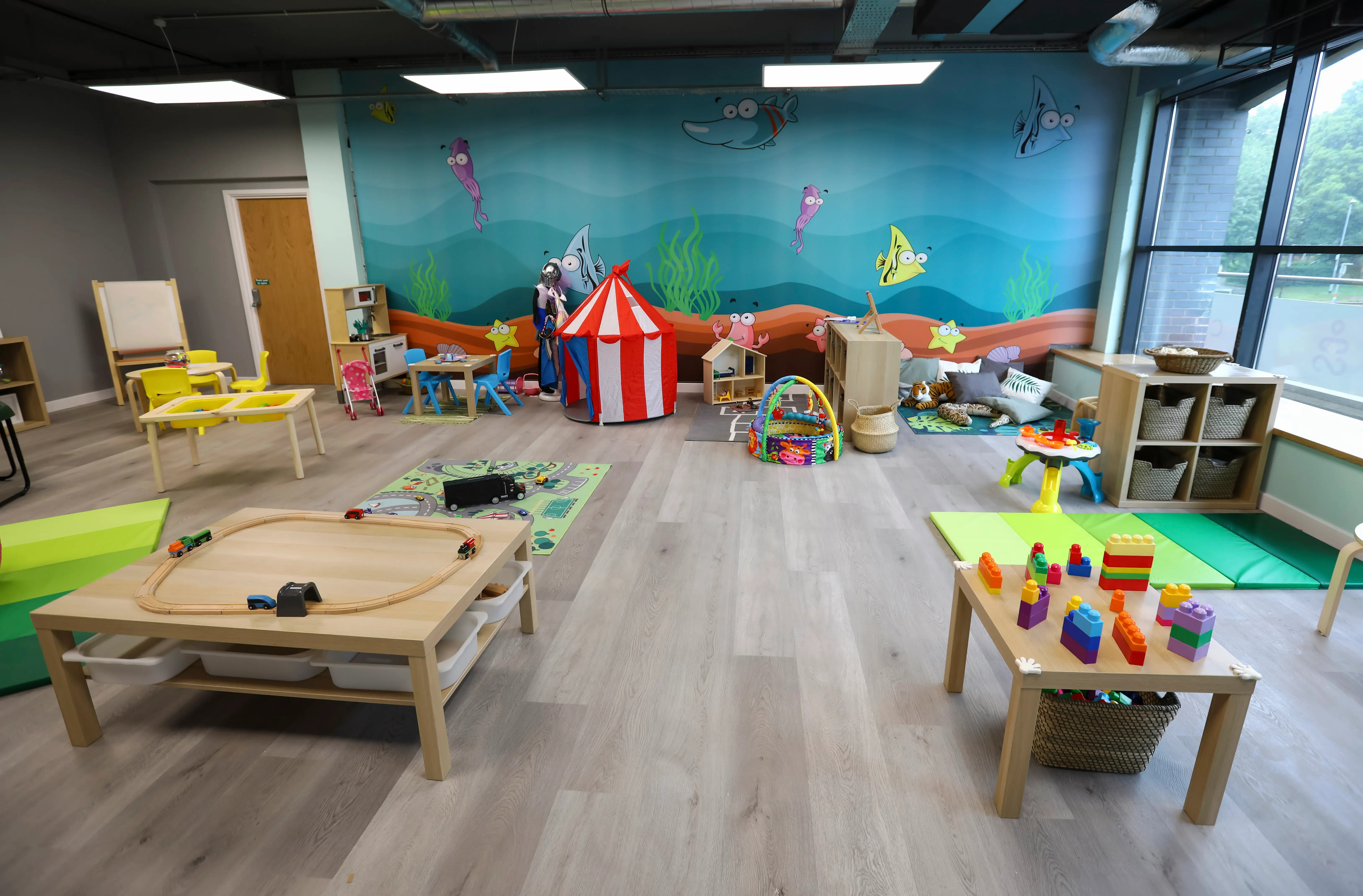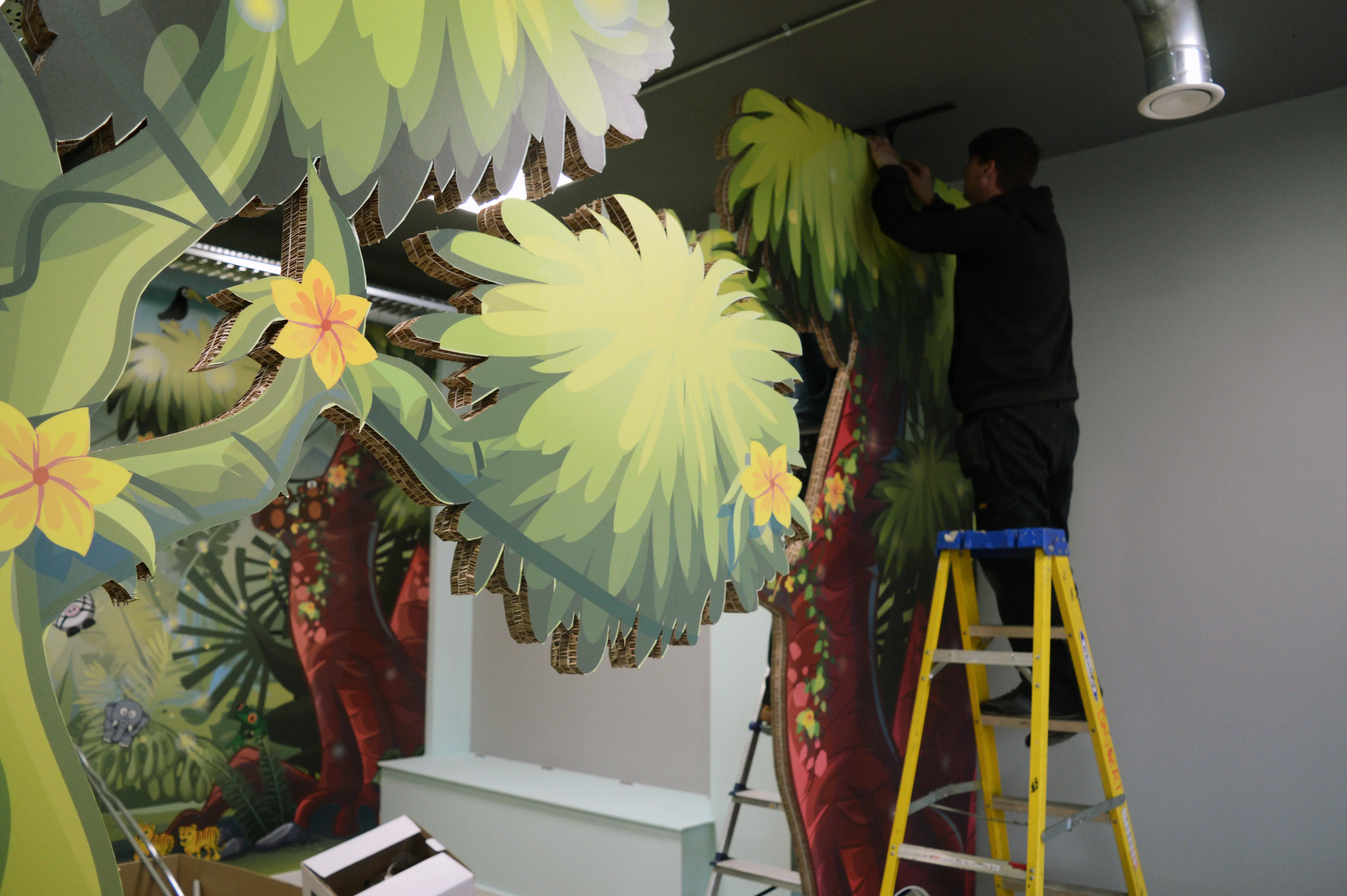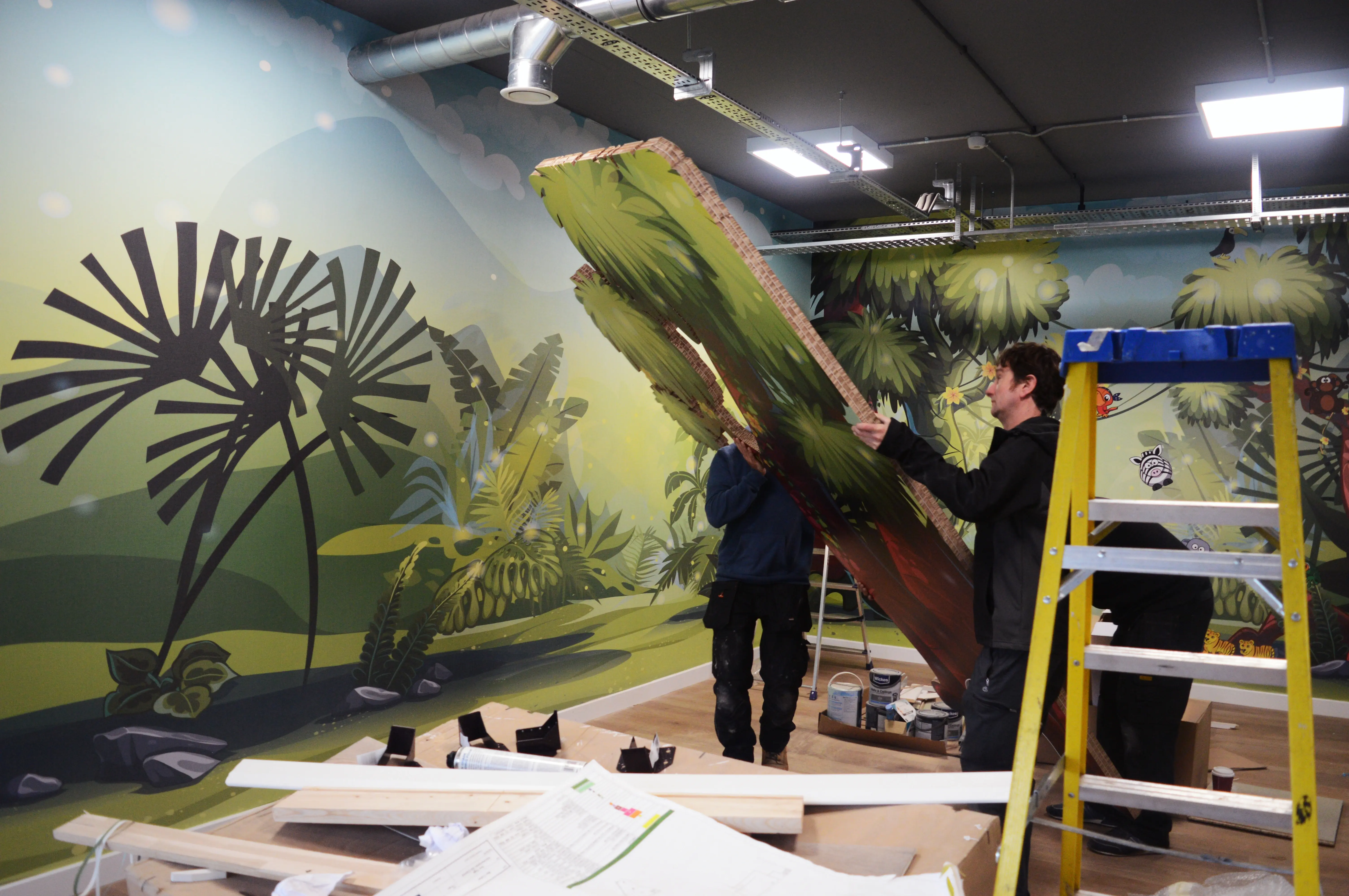One of the sustainable materials that we used was a robust and durable substrate in the children’s play area. As a result, we produced vertical partitions to create trees. These had small arches for the children to crawl through to enter a magical forest land. Which was something entirely unique that I haven’t seen done before in a children’s play area. Impressive, impactful and innovatively green. All of which delivered a 3D effect coupled with jungle printed wallpaper and a magnetic wall in the play area.
